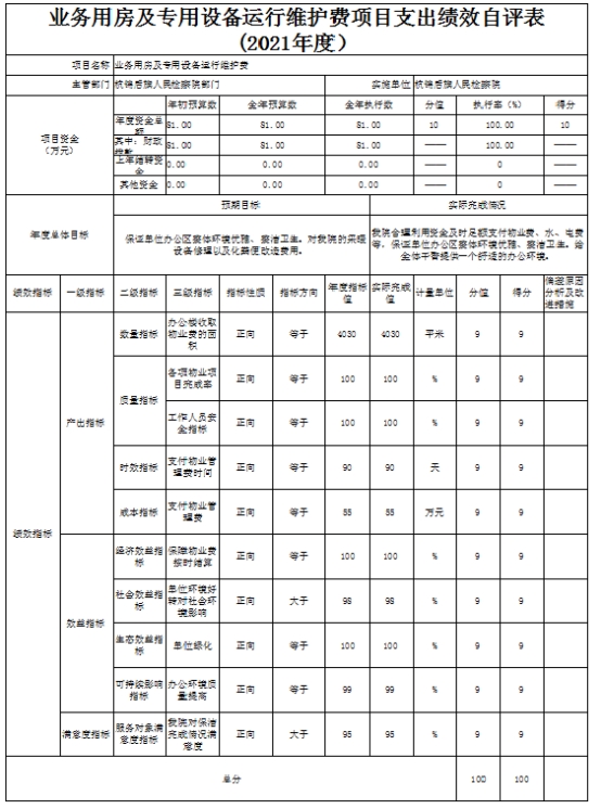 1. 业务用房及专用设备运行维护费项目自评综述:我院在业务用房及专用设备运行维护费81万元,包括水、电9万元、物业费55万元、差旅费12万元、维修费5万元。2021年按年初预算执行,没有变动。我院于2021年年底已将所有项目资金支付完毕,完成年初设定的绩效目标。我院对每一个项目都设立了产出指标,并对产出指标设立了二级指标,分别为:数量指标、质量指标、时效指标、成本指标,业务用房及专用设备运行维护费项目的产出指标:数量指标(办案数量):案件数达到1200余件。质量指标(结案率):缩短办案周期,减少办案成本,结案率≥95%。成本指标(办案成本):办案支出≤1万元。时效指标:平均办案时间≤7天。本项目绩效自评得分100分,等级为A。下一步改进措施: 在工作中全面了解项目的每一个环节,按合同规定合理安排资金,及时支付严格把关。加强监督管理机制,设置每月支出计划,严格考察资金支出进度,按月完成绩效考核;完善资金管理监督制度,让各职能部门参与资金支付的监督。