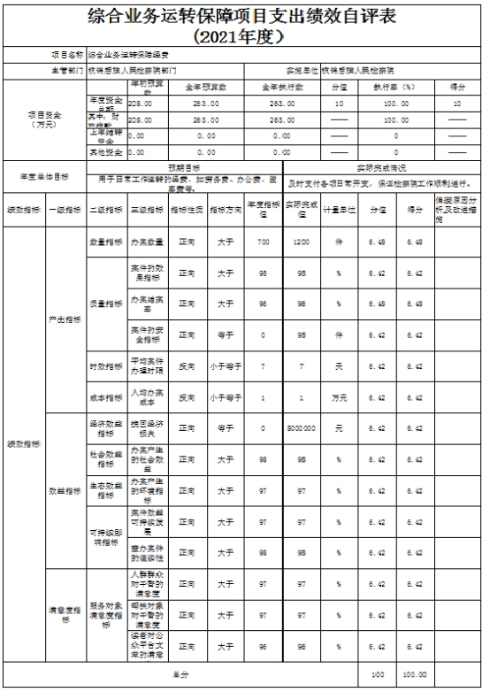 2.综合业务运转保障经费项目自评综述:我院在综合业务运转保障经费年初预算208万元,2021年执行过程中追加55万元。包括差旅费12万元、劳务费185万元、办公费10万元、咨询费1万元,委托业务费10万元,维修费45万元。我院于2021年年底已将所有项目资金支付完毕,完成年初设定的绩效目标。我院对每一个项目都设立了产出指标,并对产出指标设立了二级指标,分别为:数量指标、质量指标、时效指标、成本指标,综合业务运转保障经费项目的产出指标:数量指标(办案数量):案件数达到1200余件。质量指标(结案率):缩短办案周期,减少办案成本,结案率≥96%。成本指标(办案成本):办案支出≤1万元。时效指标:平均办案时间≤7天。本项目绩效自评得分100分,等级为A。后续工作计划,在工作中全面了解项目的每一个环节,按合同规定合理安排资金,及时支付严格把关。加强监督管理机制,设置每月支出计划,严格考察资金支出进度,按月完成绩效考核。