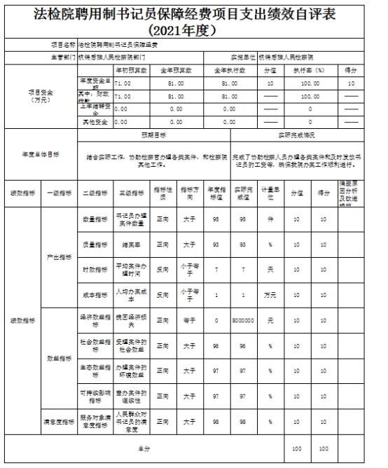 3.法检院聘用制书记员保障经费项目,自评综述我院在聘用制书记员保障经费81万元,2021年按年初预算71万元,9月份有新考录书记员经费追加10万元。用于骋用制书记员工资及五险一金的经费,确保我院办案工作顺利进行。我院于2021年年底已将所有项目资金支付完毕,完成年初设定的绩效目标。我院对每一个项目都设立了产出指标,并对产出指标设立了二级指标,分别为:数量指标、质量指标、时效指标、成本指标、效益指标,综合业务运转保障经费项目的产出指标:数量指标(办案数量):案件数达到1200余件。质量指标(结案率):缩短办案周期,减少办案成本,结案率≥93%。成本指标(办案成本):办案支出≤1万元。时效指标:平均办案时间≤7天。本项目绩效自评得分100分,等级为A。后续工作计划:365app下载手机版_365赢了不让提款_完美365体育ios下载人民检察院将继续按照中央与自治区政策要求加强绩效管理,不断学习文件精神,总结经验,强化资金管理意识,建立科学的监督管理体制机制。重视学习系统的财务管理知识,加强资金的使用监控,完善采购计划,提前做出采购规划,联系好供应商,在合法合理的情况下尽量缩短采购周期,不影响绩效考核。加强绩效评估,更好的完成本单位以后年度一般公共预算所有项目资金使用的监控与自查工作,确保顺利完成预算绩效目标。