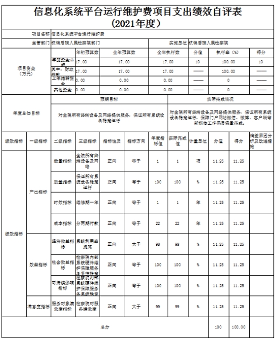 4.信息化系统平台运行维护费项目自评综述,我院在信息化系统平台运行维护费17万元,2021年按年初预算执行,没有变动。包括信息化技术运营服务费7.5万元,融媒体技术服务费9.5万元。我院于2021年年底已将所有项目资金支付完毕,完成年初设定的绩效目标。我院对每一个项目都设立了产出指标,并对产出指标设立了二级指标,分别为:数量指标、质量指标、时效指标、成本指标,业务用房及专用设备运行维护费项目的产出指标:数量指标(办案数量):全院有终端设备及网络服务。质量指标):保证所有系统设备稳定运行。成本指标:分两期支付。时效指标:维修期一年。本项目绩效自评得分100分,等级为A。后续工作计划,完善资金管理监督制度,让各职能部门参与资金支付的监督。