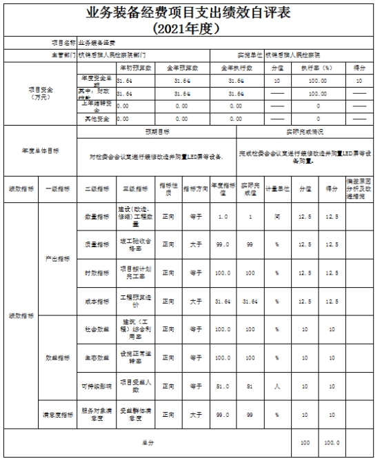 5. 业务装备经费项目自评综述:我院业务装备经费追加预算31.64万元。用于检委会会议室进行装修改造13.64万元,购置LED屏18万元等设备购置。我院于2021年年底已将所有项目资金支付完毕,完成年初设定的绩效目标。我院对每一个项目都设立了产出指标,并对产出指标设立了二级指标,分别为:数量指标、质量指标、时效指标、成本指标,综合业务运转保障经费项目的产出指标:数量指标:建设(改造、修缮)工程数量1间。质量指标:竣工验收合格率≥99%,时效指标:项目按计划完工率100%。成本指标:工程预算造价31.64万元。本项目绩效自评得分100分,等级为A。后续工作计划:365app下载手机版_365赢了不让提款_完美365体育ios下载人民检察院将继续按照中央与自治区政策要求加强绩效管理,不断学习文件精神,总结经验,强化资金管理意识,建立科学的监督管理体制机制。重视学习系统的财务管理知识,加强资金的使用监控,完善采购计划,提前做出采购规划,联系好供应商,在合法合理的情况下尽量缩短采购周期,不影响绩效考核。加强绩效评估,更好的完成本单位以后年度一般公共预算所有项目资金使用的监控与自查工作,确保顺利完成预算绩效目标。